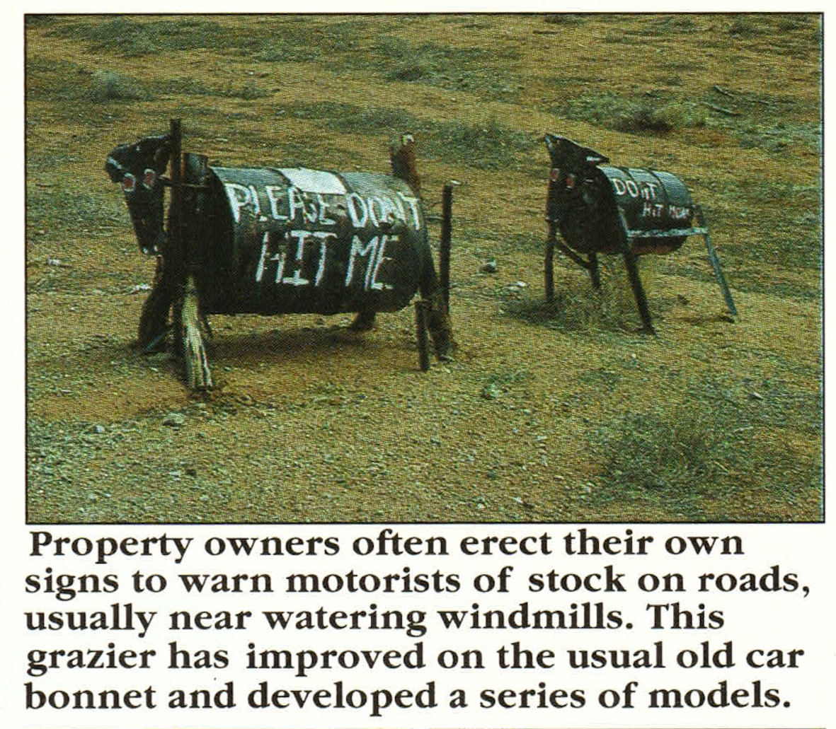 Animals are a hazard on Outback roads. Kangaroos and cattle are attracted to the lusher growth at the verges, particularly at dawn and dusk. They are unpredictable, resulting in many single vehicle accidents. These may not be covered in the basic insurance. It is best to avoid driving at dawn, dusk and during the hours of darkness, but if it's necessary, slow down.