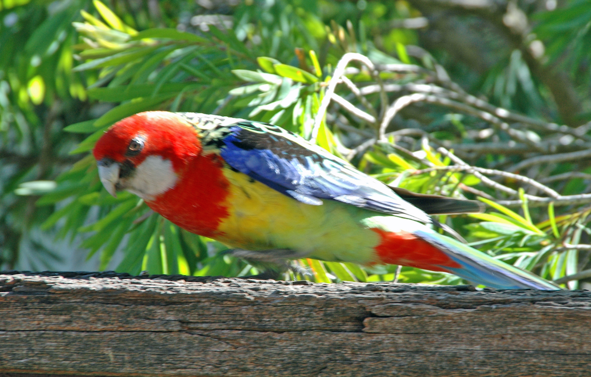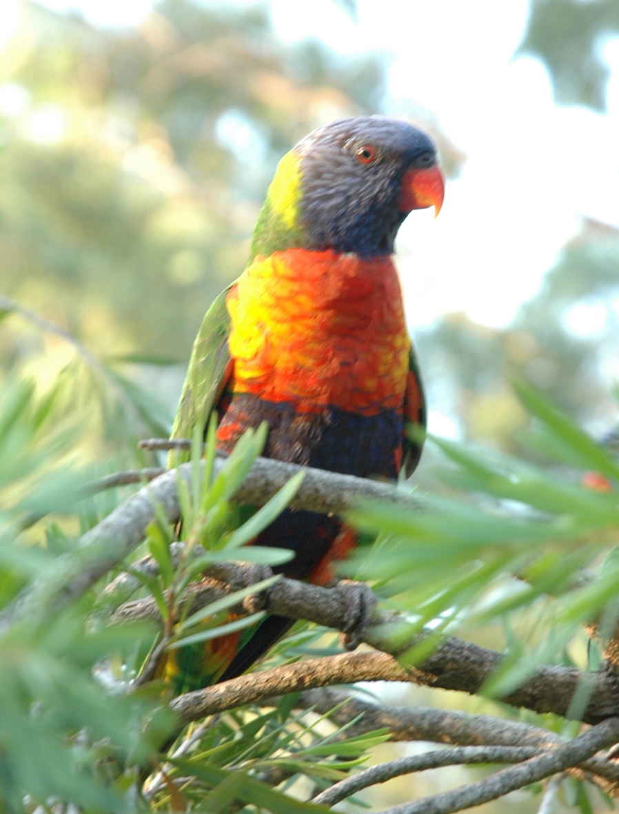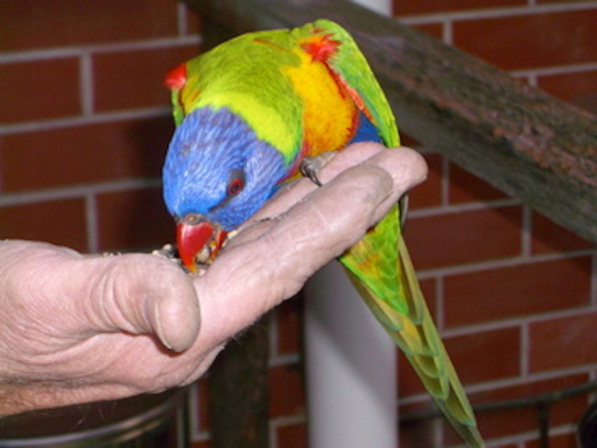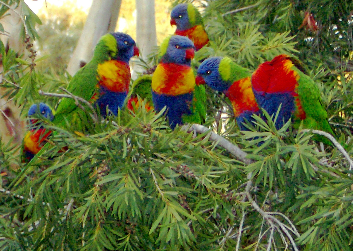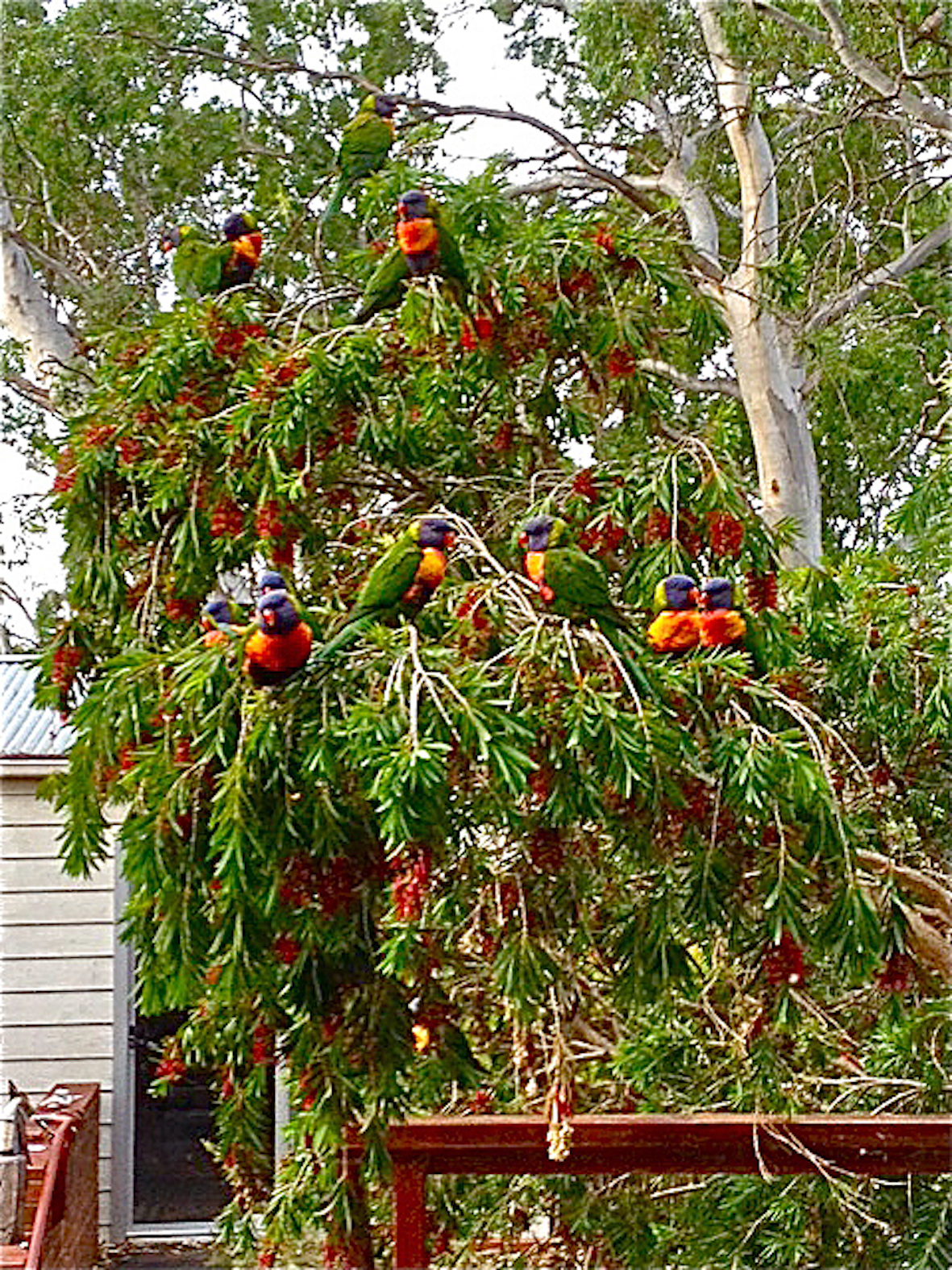 We soon found that the rainbows were fussy eaters and the wild bird mixture we purchased from the supermarket was not to their taste. They only ate the sunflower seeds, ignoring the other seeds, so we began to buy 30 kilogram bags of sunflower seeds from the local fodder merchant, which they appreciate. Now they are waiting in the callistemon, that overhangs out deck, every morning for breakfast and every evening for dinner. As soon as they see us in the kitchen they become excited. A few move to the window sill and tap on the window to let us know they are waiting. Others eat out of my hand, and these are wild birds.