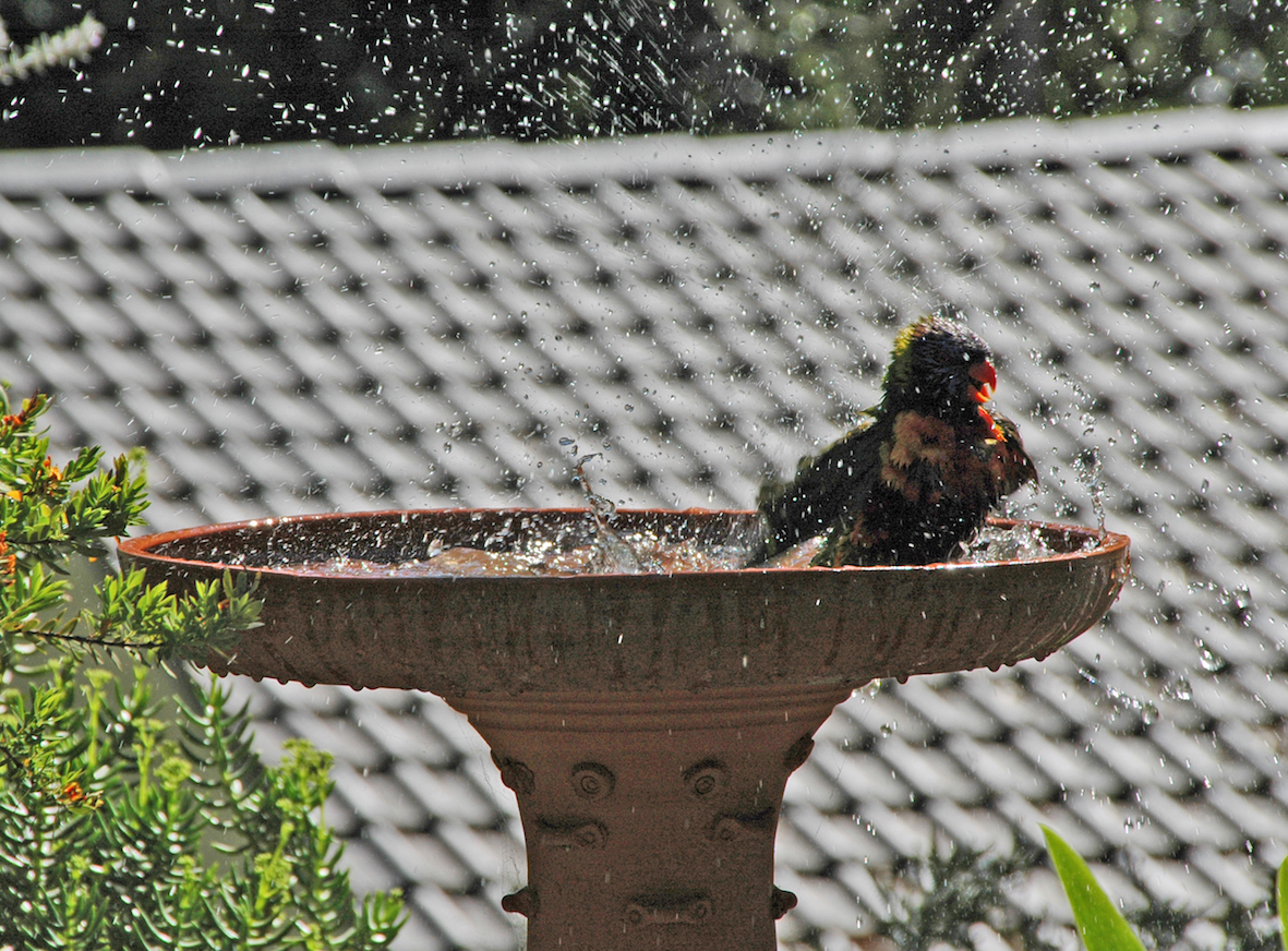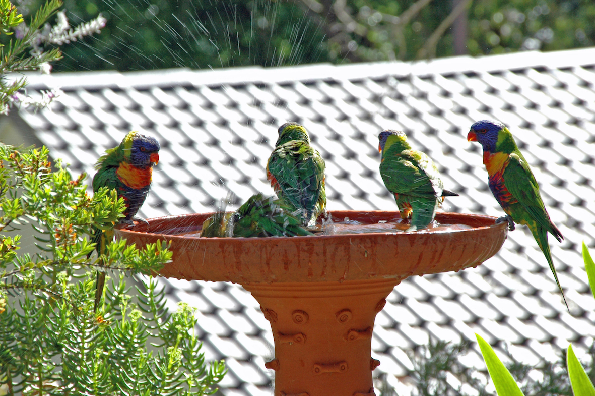 Before we installed our new birdbath, our garden had been the undisputed domain of the miners. Now their world was shattered and hordes of newcomers had taken over. Boisterous rainbow lorikeets had laid claim to the bath, squabbling among themselves and allowing few others near the water. Only the musk lorikeets stood up to their larger cousins.