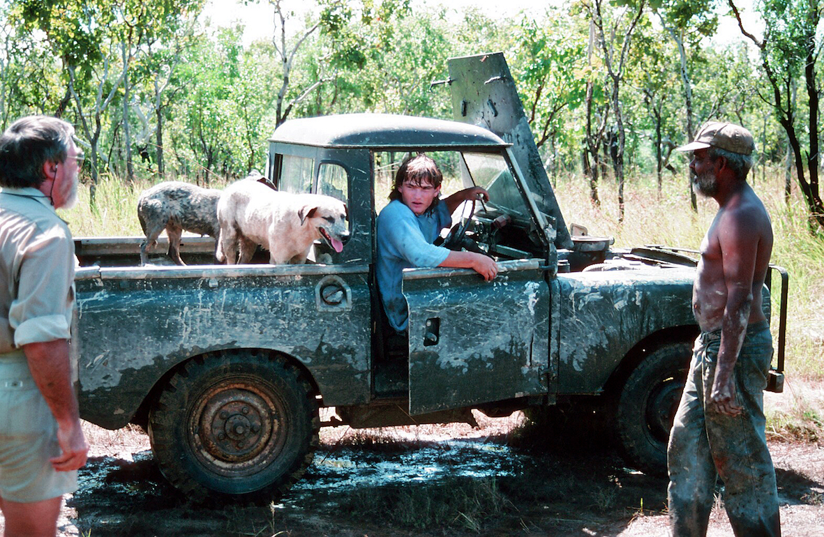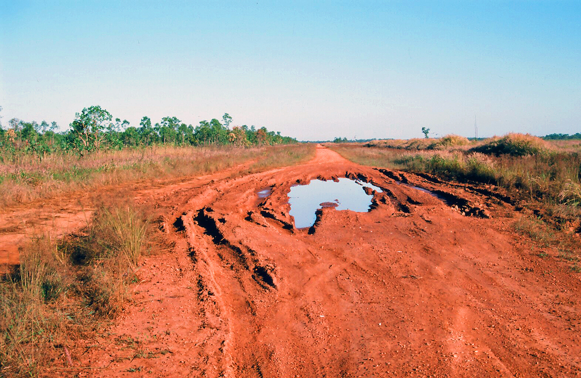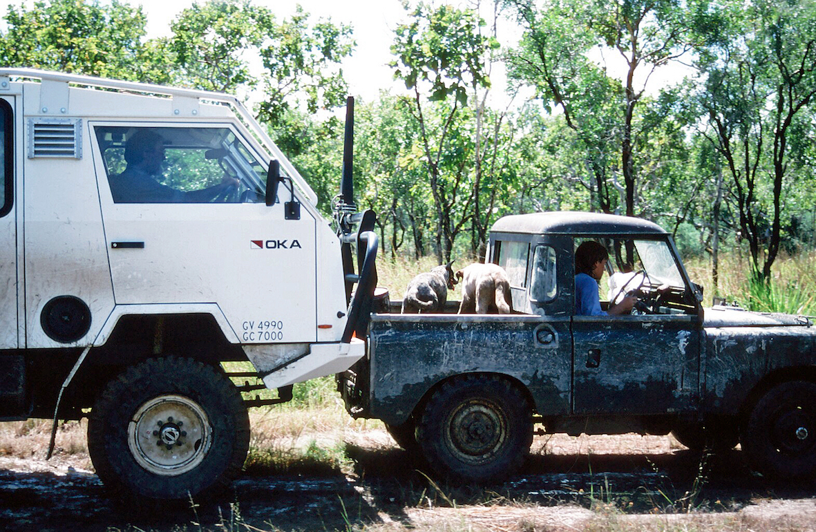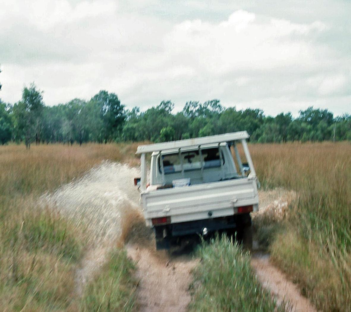 We had only travelled a few hundred metres back along the track when we saw the decrepit Landrover leaping and splashing through the quagmire towards us. We stopped and waited until the battered machine pulled alongside. An Aborigine got out and introduced himself as Peter and the white driver as Alex. Two dogs shared the open tray with spare wheels, a drum of petrol and a variety of discarded junk.