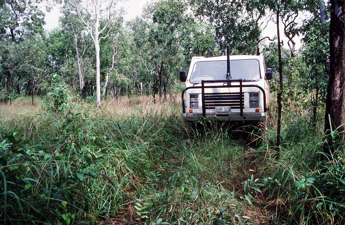 The road deteriorated and became a track. The track degenerated and became indistinct, until it disappeared completely. Just as we decided to turn back two lads in a Toyota tray top drove up. They confirmed we were on the right road and after a little discussion between themselves agreed that we would get across the Adelaide River.