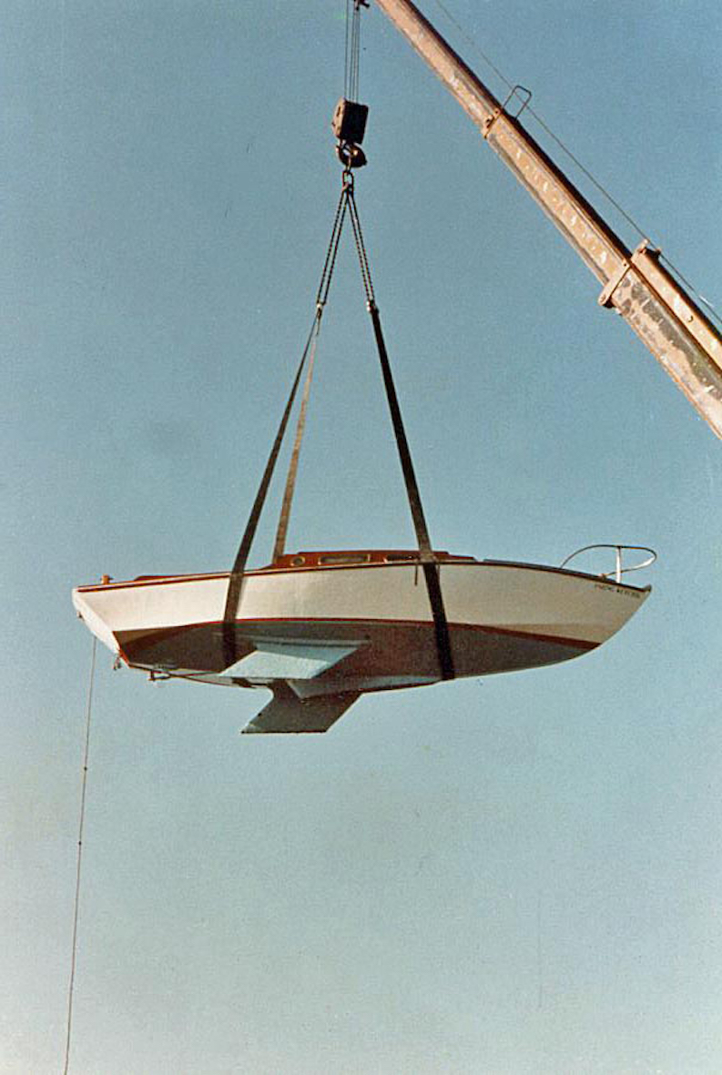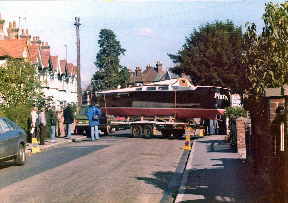 I had checked with a local crane hire company about getting the boat out of my back garden before I began the build, but when I approached them on completion of the build I discovered they no longer had a crane that would pass down my drive. Instead they offered a huge machine that would lift it over the house, which fortunately was a bungalow. So Anjing Ketchil became a flying boat for a short while.