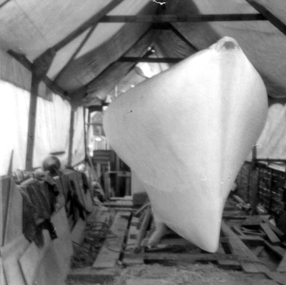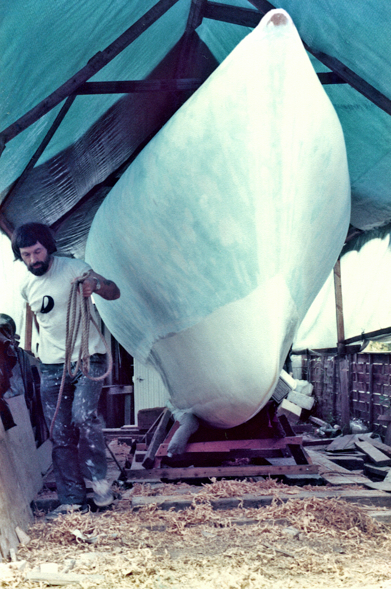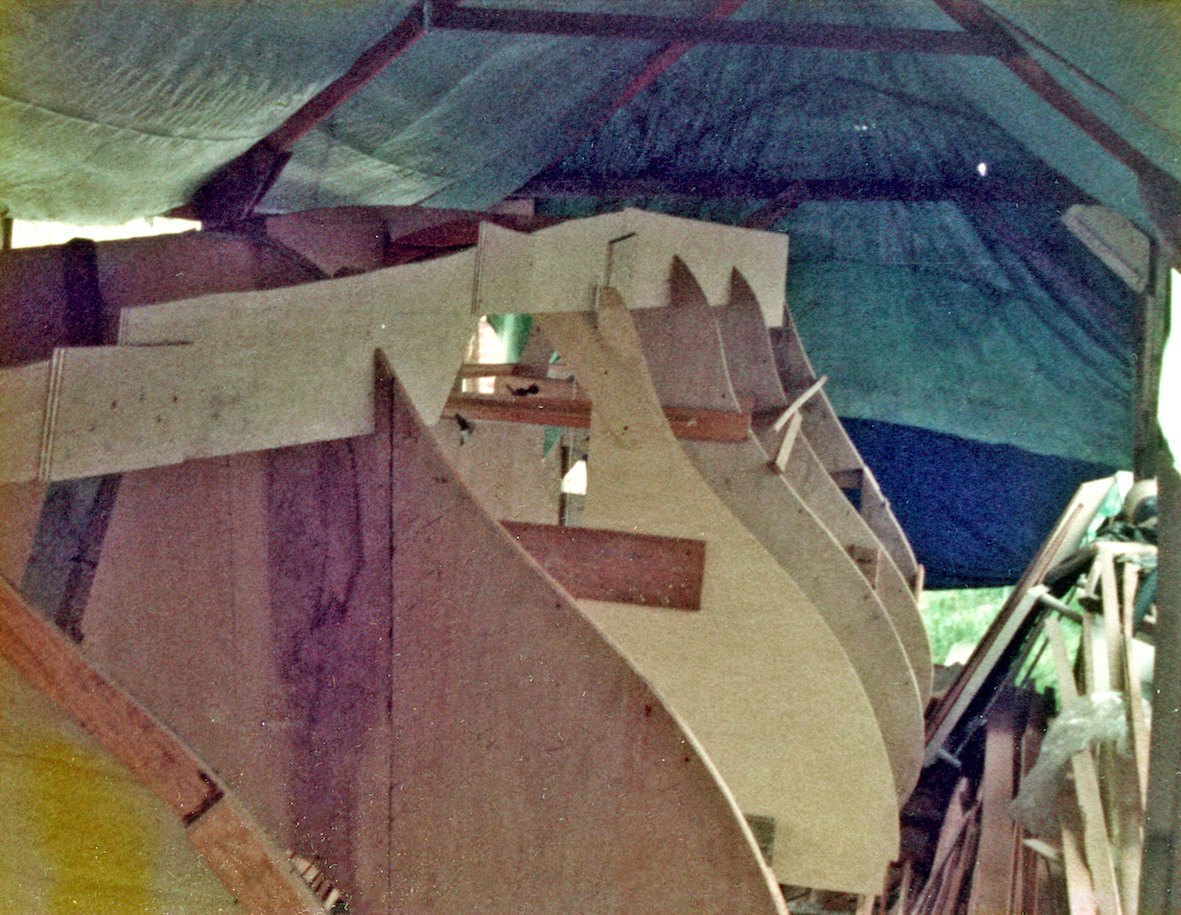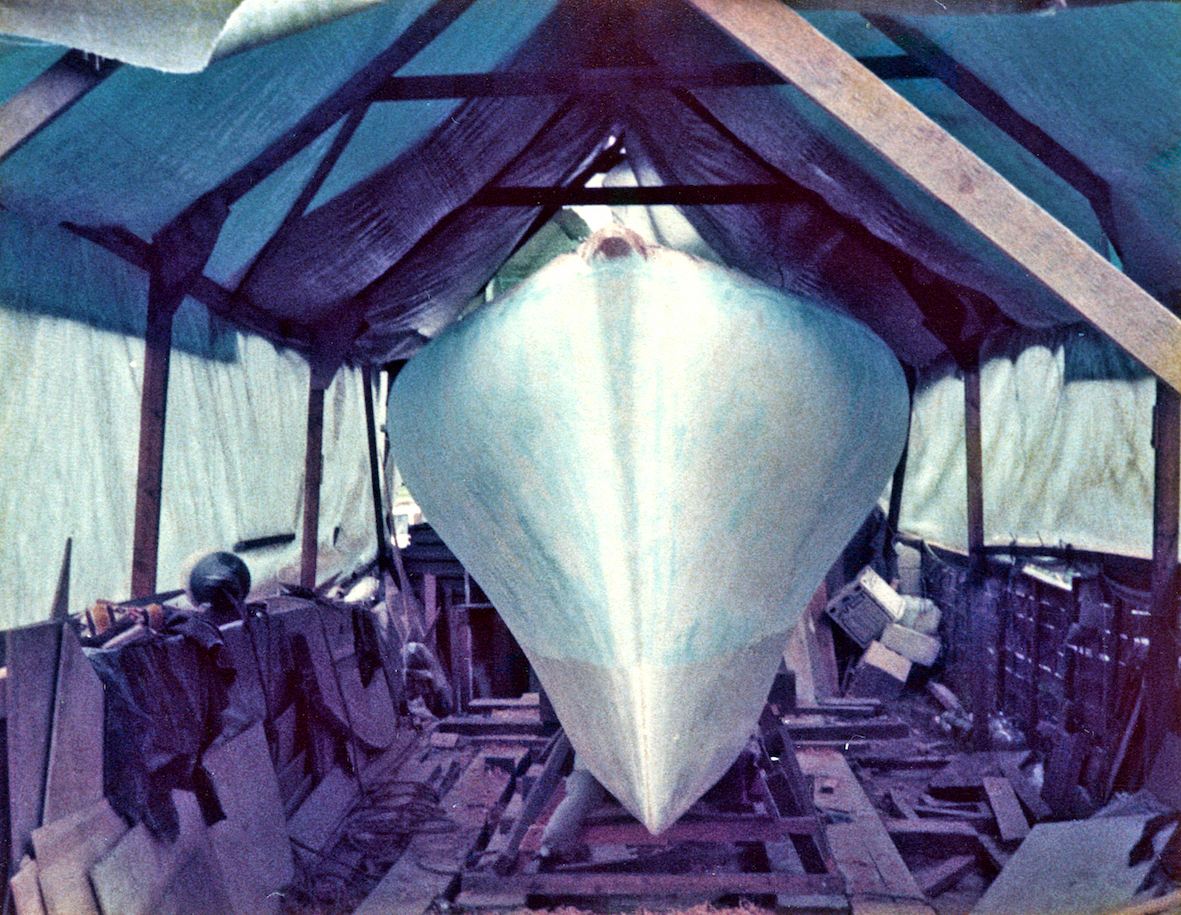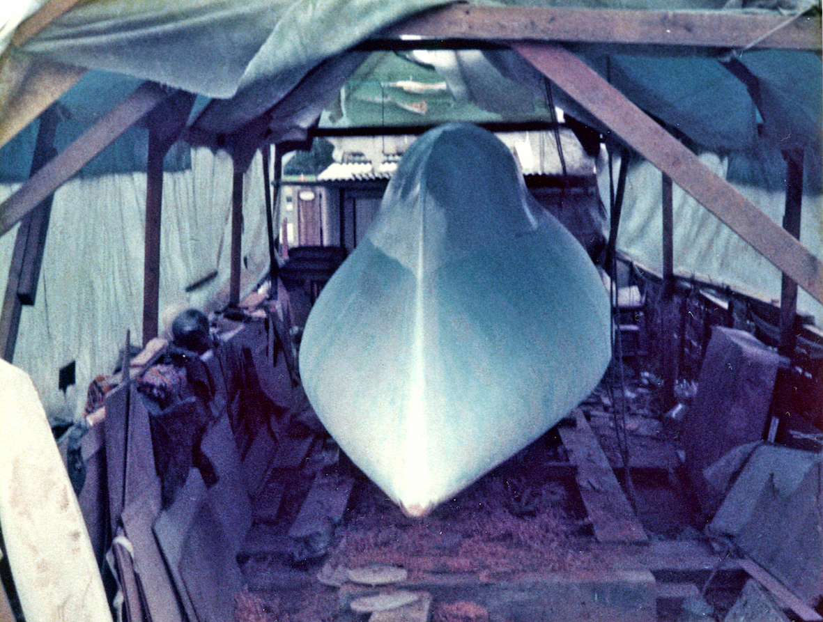 The initial task was to erect a temporary cover over the back garden to protect the project. That temporary shelter remained for five years, the time it took to build the trimaran. By that time the OSTAR was history and the rules for the next race, some four years later, had been altered. No longer did the design comply with the smallest class, but that's life.