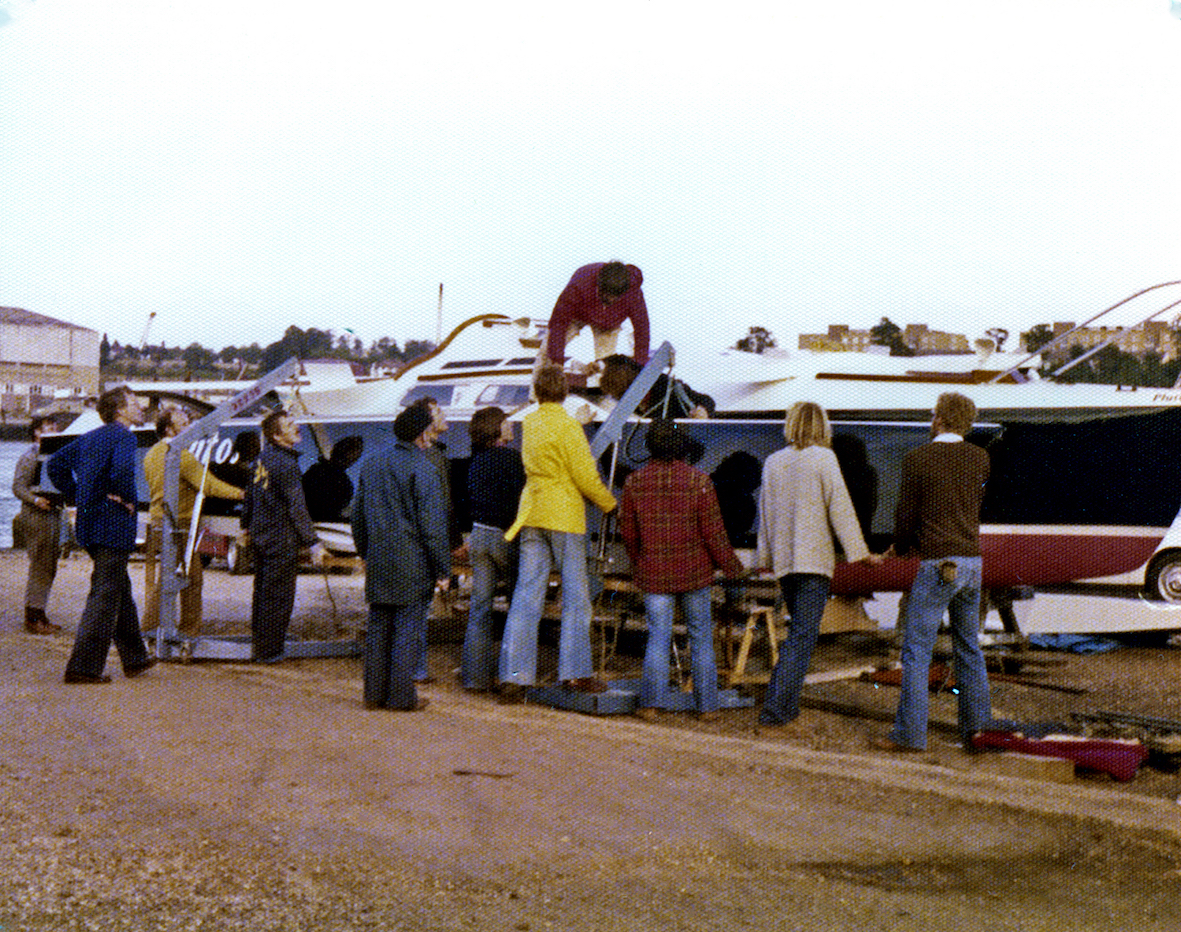 After the initial design work the floats were even more extreme. The same length overall and waterline length as the main hull, they had a mere twelve inches maximum beam. They would slice through the water like a knife on edge, their wave-making resistance minimal. They were also designed so they were unable to support the full displacement of the boat. That was the theory, but how dynamics would affect the lift was an unknown.
