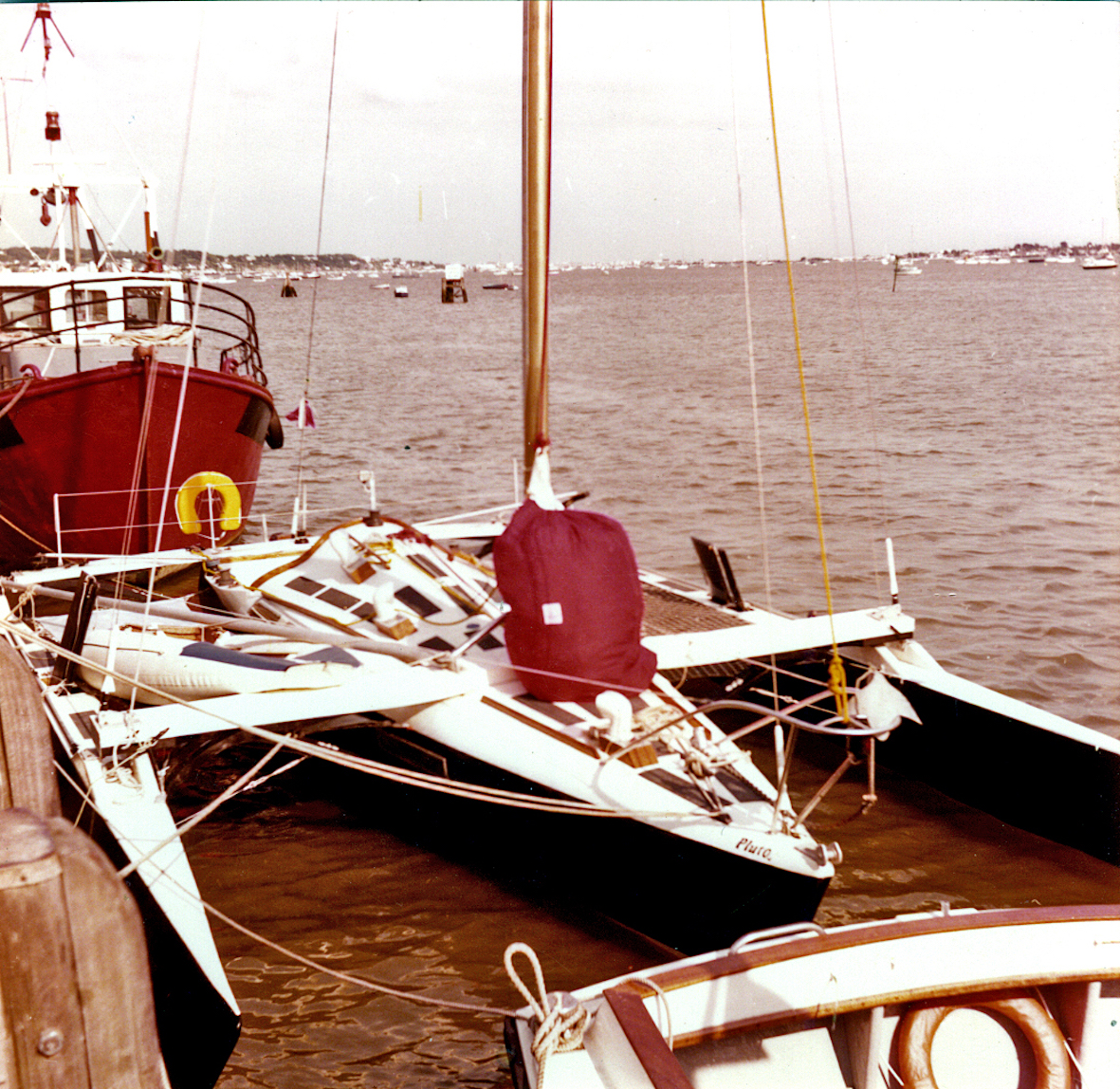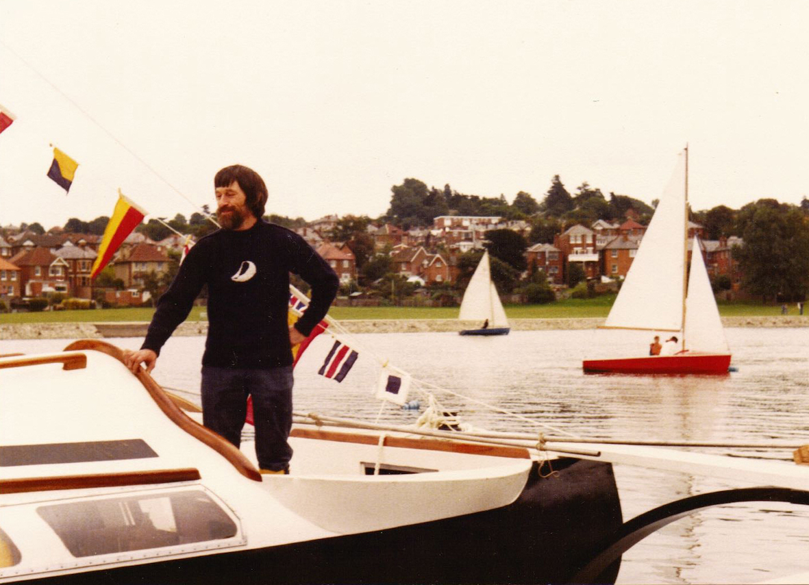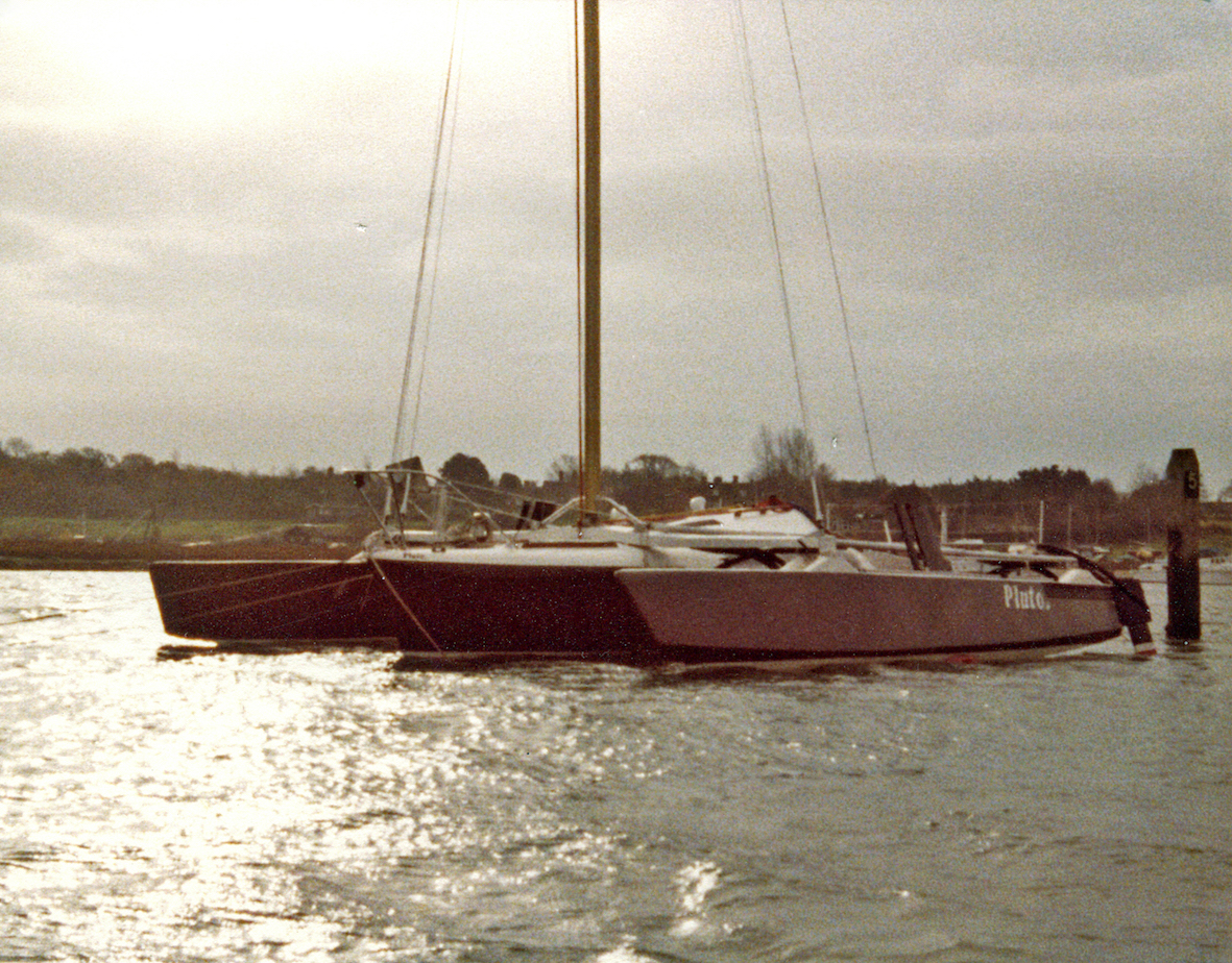 We had a black and white Afghan hound, or as some people insist, black and silver. That gave us the paint scheme — black hulls, white decks. The boat performed extremely well, until I filled it with stores with the intention of sailing it to Australia. Loaded for that trip the trimaran displaced about twice that designed, so instead of riding over the waves like a thoroughbred, it smashed through them. Due to the extra loading this increased the stresses on the structure, way over the design levels. A few days after leaving England I discovered that the heel fitting at the mast was beginning to disintegrate. It was one of the few parts of the boat I hadn't made myself. I was reluctant to abandon the voyage, but with over 12,000 nautical miles still to cover I had no alternative, so after a calming cognac, I turned the boat round to return to England.
