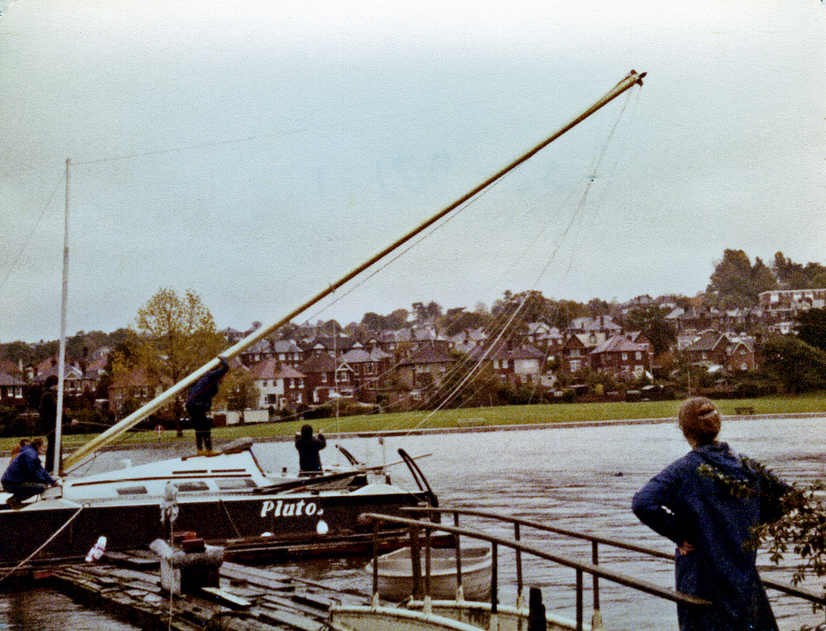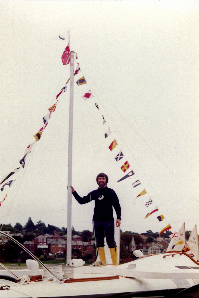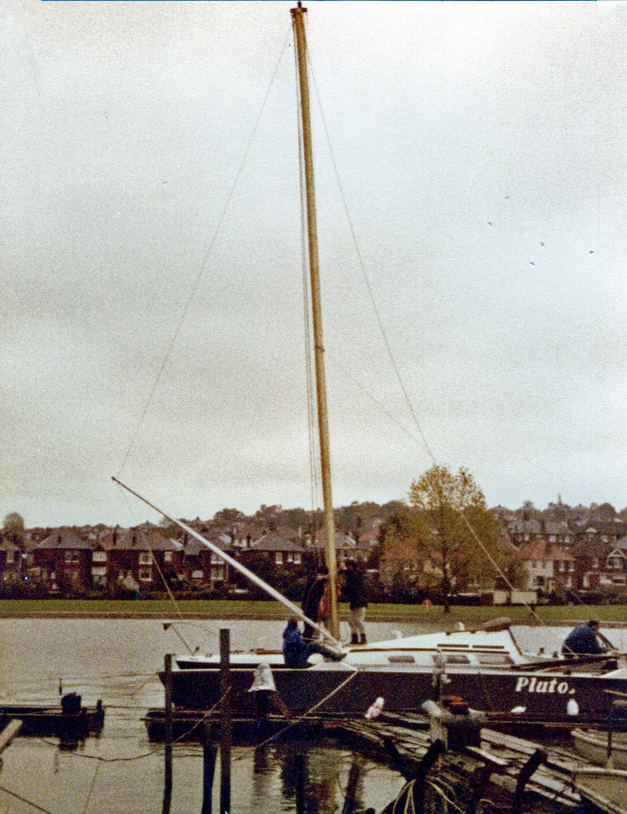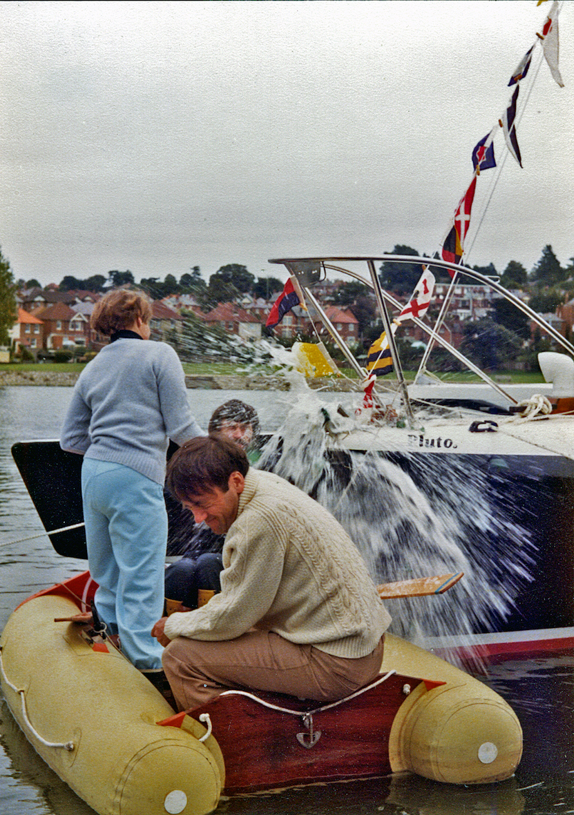 We had a black and white Afghan hound, or as some people insist, black and silver. That gave us the paint scheme — black hulls, white decks. The boat performed extremely well, until I filled it with stores with the intention of sailing it to Australia. Loaded for that trip the trimaran displaced about twice that designed, so instead of riding over the waves like a thoroughbred, it smashed through them. Due to the extra loading this increased the stresses on the structure, way over the design levels. A few days after leaving England I discovered that the heel fitting at the mast was beginning to disintegrate. It was one of the few parts of the boat I hadn't made myself. I was reluctant to abandon the voyage, but with over 12,000 nautical miles still to cover I had no alternative, so after a calming cognac, I turned the boat round to return to England.